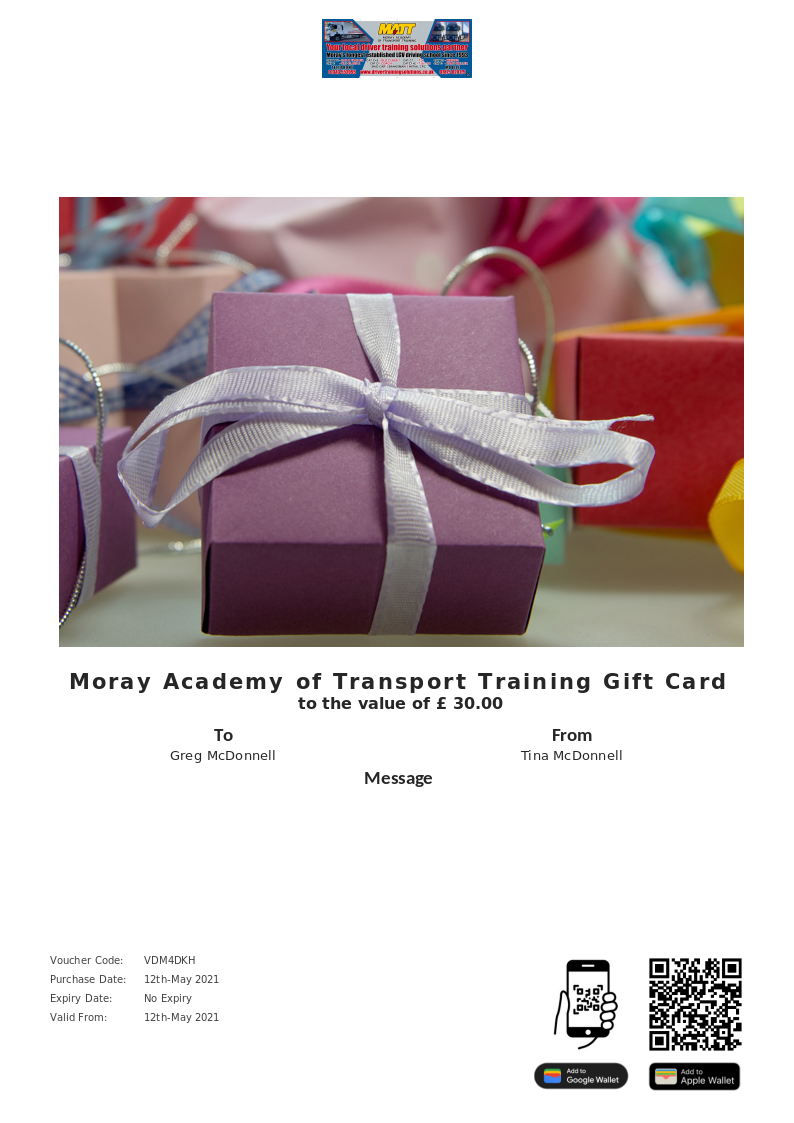 Moray Academy of Transport Training allows you to purchase instantly printable gift vouchers, special offers and tickets using the Voucher Connect platform.